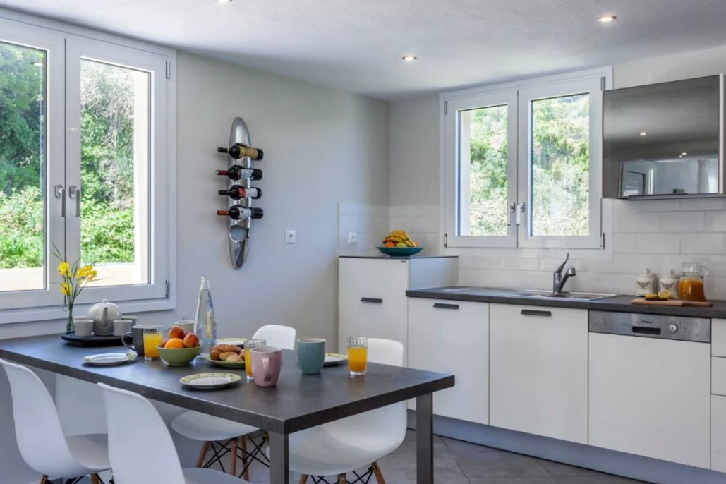 Aegean Breeze is thoughtfully crafted for those who seek a blend of architectural elegance and slow-living luxury. The villa’s refined interiors feature natural materials like stone and polished cement, blending seamlessly with curated furnishings and minimal décor. The fully equipped kitchen includes modern appliances and flows into a spacious living area, bathed in natural light from expansive windows that frame the sea beyond.
