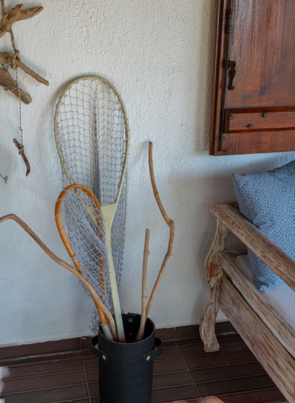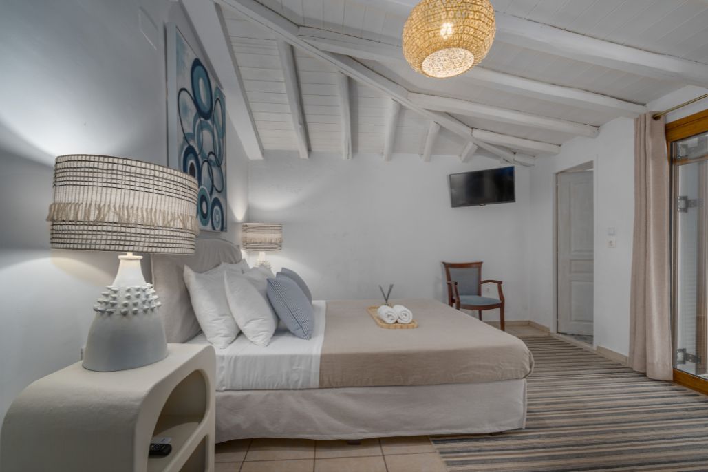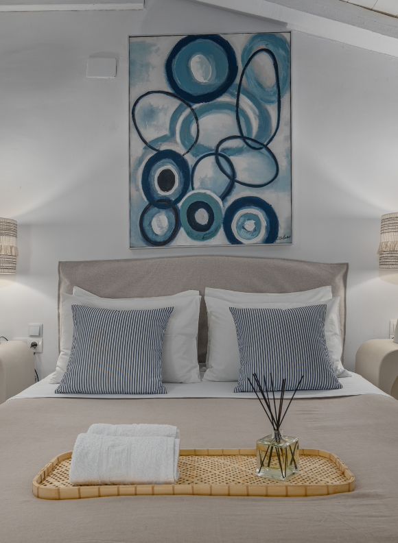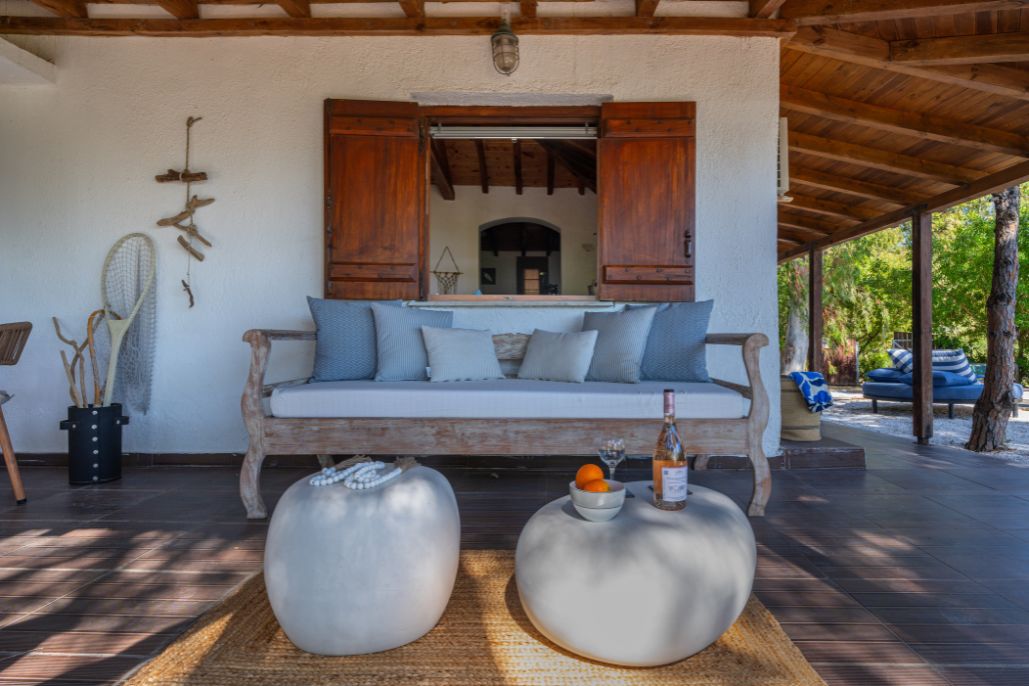 Amouage Boutique Home is a stunning beachfront retreat that resembles a traditional fisherman’s house, set directly on the soft sands of the Aegean Sea. Recently renovated, the villa seamlessly blends island-inspired and bohemian design elements, creating an inviting space that captures the essence of beachside living.