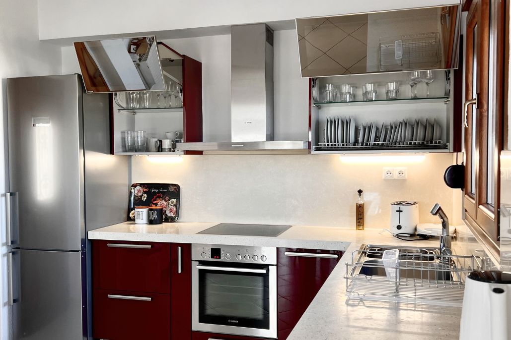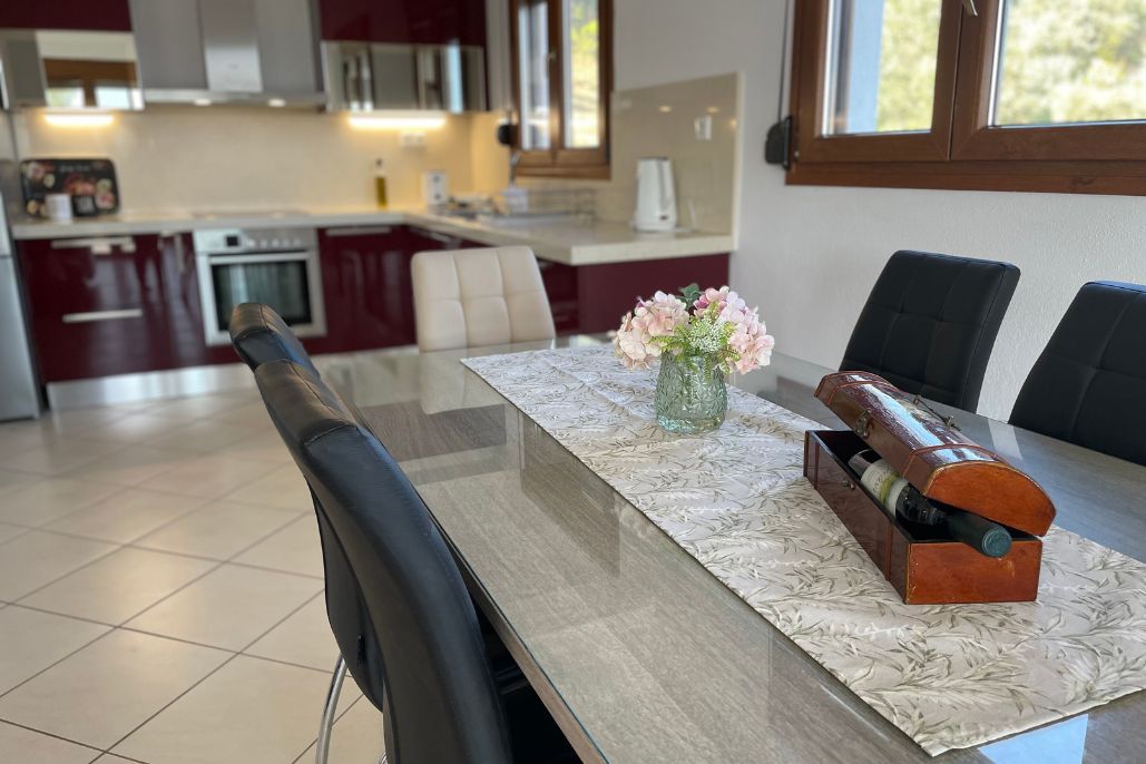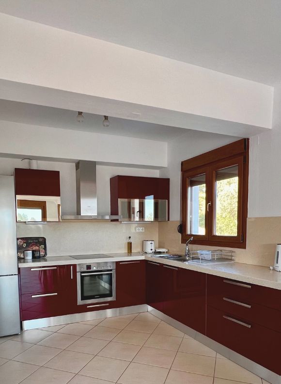 The villa’s interiors include a fully equipped kitchen complete with oven, refrigerator, microwave, coffee machine, and all essential kitchenware — perfect for preparing relaxed meals at home. The cozy lounge space opens directly onto the terrace, creating a seamless flow between indoors and outdoors.