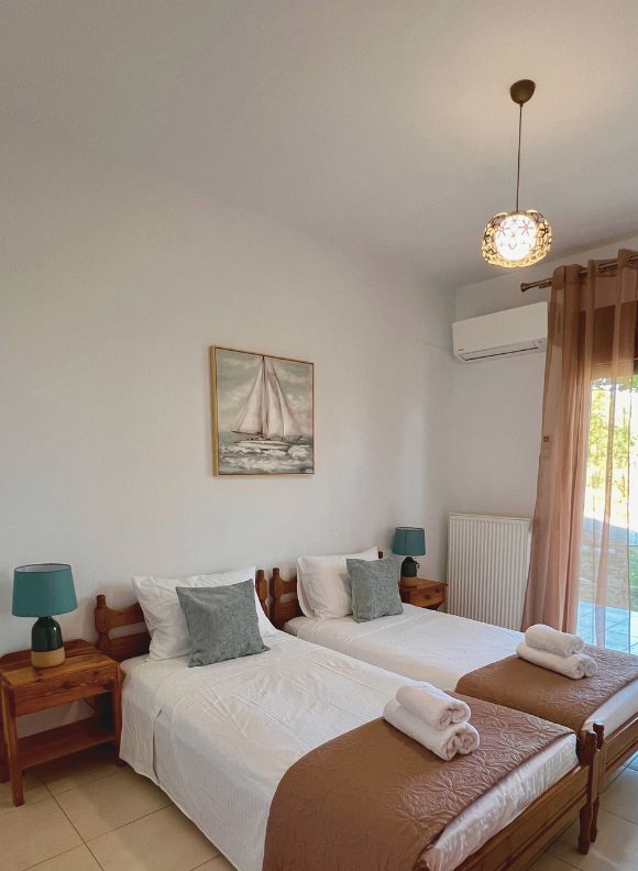 Fully updated, the villa features three bright and airy bedrooms with queen-size beds, two modern bathrooms, and comfortably hosts up to six guests. Designed with comfort and natural beauty in mind, the villa blends understated luxury with traditional island charm — making it ideal for families or small groups.