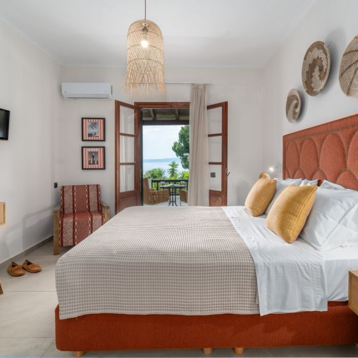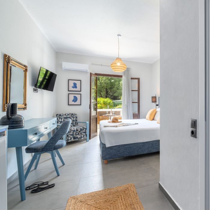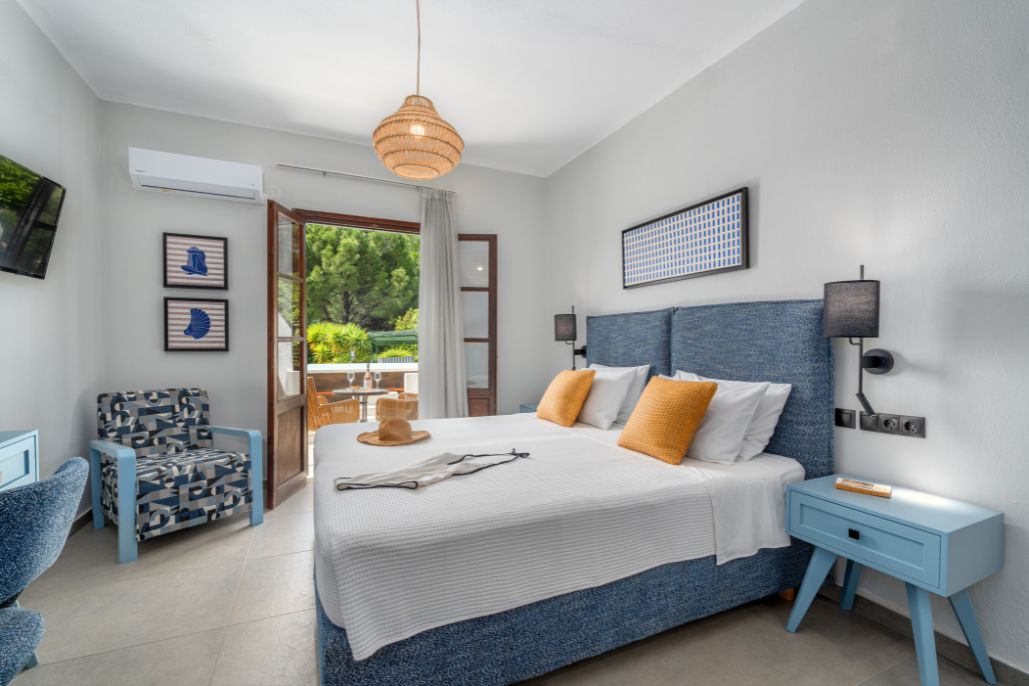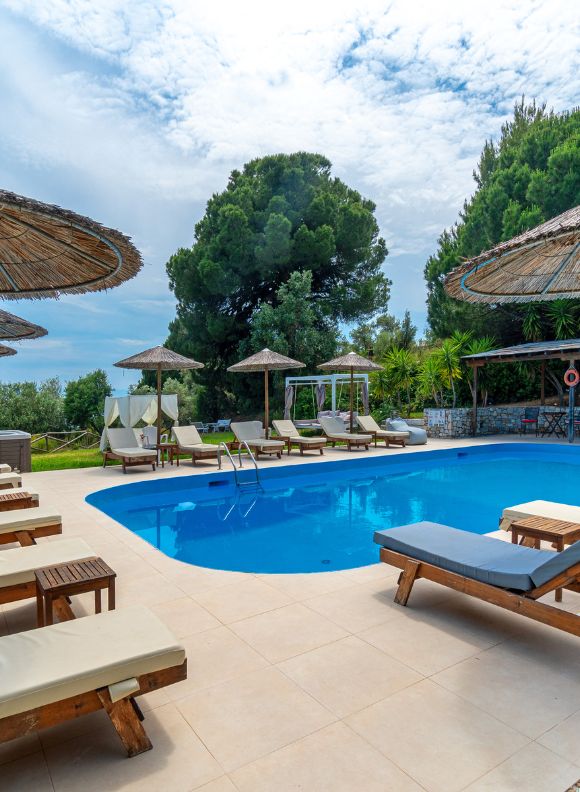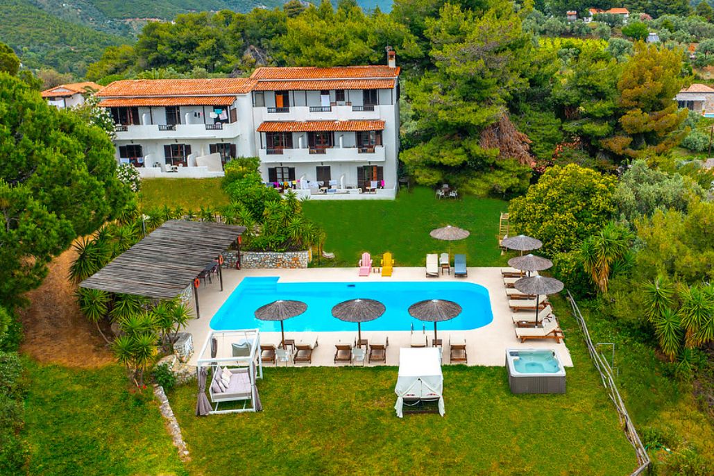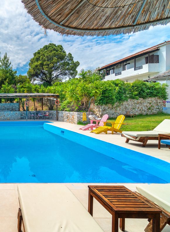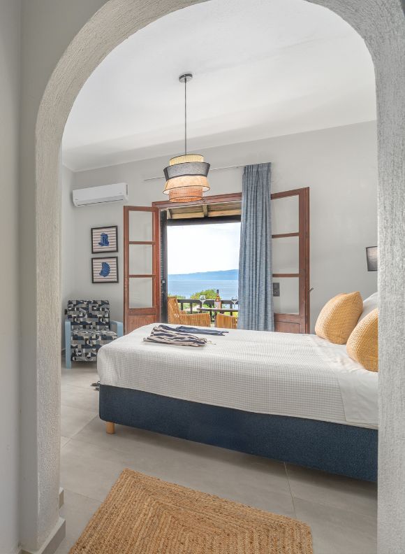 Margi House is a boutique retreat designed for those who seek calm, comfort, and coastal charm. The studios and apartments are styled with soft natural hues, handcrafted details, and large windows that frame the horizon. Each space is thoughtfully equipped with modern amenities, private verandas, and access to a serene pool surrounded by pine trees.