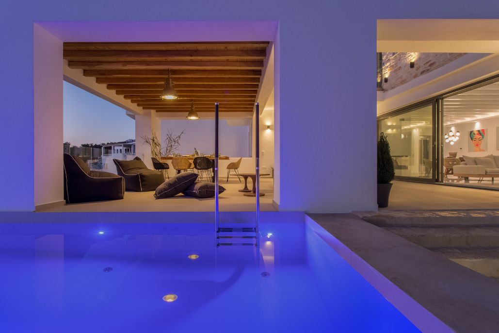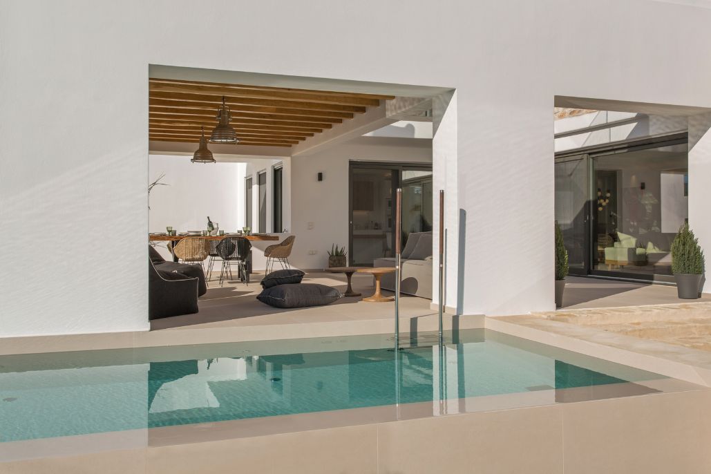 The villa’s outdoor area is designed for carefree island days, featuring a private pool, sun loungers, shaded dining space, and wide-open views across the landscape.